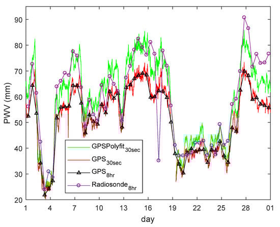 purple line with circle markers and black line with triangle markers represent the radiosonde and GPS PWVs, respectively, every 12 h; and PWV computed by the GPS (red line) and polynomial fit (green line) with a 30 s interval.