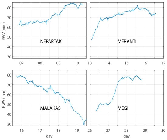 The average PWV over Zhejiang province during NEPARTAK, MERANTI, MALAKAS, and MEGI typhoons. NEPARTAK occurred in July, and the other three typhoons occurred in September.