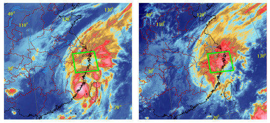 The route of MERANTI entirely embraces Zhejiang province. Figure 12 shows the infrared satellite images from China FT2E-IR1 at 03:30 and 14:30 on 15 September, at which time the typhoon had just made landfall (left panel) and then began to change direction (right panel) from the northwest to the northeast. The red color in Figure 12 shows convection developing vigorously in that particular region, demonstrated by thick cloud. The green box in Figure 12 shows the research region in this study.