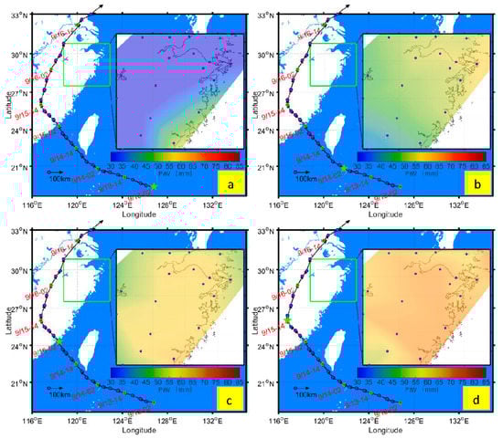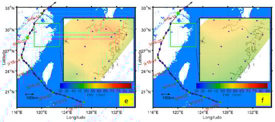 The radiosonde stations launch the air balloons twice a day strictly at 07:15 and 19:15 in China. This means that PWV from radiosonde can only be obtained at specific epochs. It is thus not possible to calculate PWV when there is no radiosonde event or when a typhoon passes a place without a radiosonde station. The PWV over Zhejiang province is plotted twice a day at 02:00 and 14:00 local time. Table 2 shows the minimum, maximum, and average PWV over Zhejiang province during the typhoon event. The average PWV kept increasing when the typhoon travels from southeast to northwest, and decreases when the typhoon changed its direction at 14:00 on 15 September. Figure 13 illustrates the change in trend of PWV according to the typhoon route from 02:00 on 13 to 14:00 on 16 September 2016 over Zhejiang province. Figure 13a shows that PWV over the land near the sea is higher than the inland PWV when the typhoon is far away (Lat: 19.3° N; Long: 126.8° E) from the China mainland. Most of the PWV distributed over Zhejiang province is very low, although it is high at Ruia and Taiz GPS stations. The minimum and maximum PWV are 26.27 mm and 76.13 mm, respectively. Figure 13b,c shows the PWV distributions over Zhejiang province from 02:00 on 14 to 02:00 on 15 September 2016, during which time the typhoon heads to Xiamen Fujian province. The PWV distribution at 14:00 on 13 September and 14:00 on 14 September can be found in Appendix A. Before the typhoon makes landfall on China mainland, the PWV in Zhejiang province gets higher as the typhoon gets closer to China. When MERANTI makes landfall in Xiamen, the PWV in Zhejiang was almost uniformly distributed with a higher PWV (Figure 13c). MERANTI changed its direction to the northeast of China at 14:00 on 15 September, during which time the PWV is highest in Zhejiang province (Figure 13d). The average PWV over Zhejiang province is up to 82.23 mm during this time, and starts to decline when the typhoon travels from southwest to northeast. Figure 13d–f shows that the peak of PWV moved from southwest to northeast of China in same direction to that of the typhoon centre. Figure 13f shows that the PWV distribution over Zhejiang province at which time the MERANTI typhoon is departing. Figure 13d–f reveals that the peaks of PWV distribution are normally in front of the typhoon centre, in the direction of the typhoon movement.