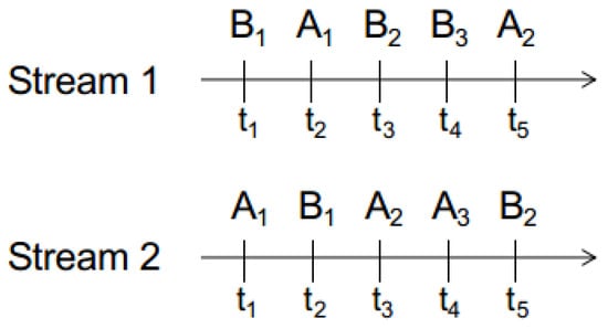 Figure 2. Two example streams to illustrate the various event operators. Each of the streams produces events of the type A or B at different time steps, indicated by . - OR is a binary operator: A OR B matches if either A or B occurs in the stream. In Figure 2, A OR B matches at in both Stream 1 and Stream 2.