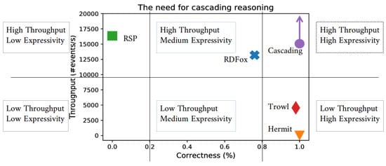 In Section 6.1, we evaluated the throughput of different reasoning systems and compared them to a cascading approach. The evaluation shows that, by combining different approaches, both high throughput and high expressivity can be achieved, what is not possible with a monolithic approach. The achieved throughput and expressivity is depending on the components used in the layered approach. Different throughputs can be achieved by combining different engine complexities. For example, if we would combine RSP with RDFox (instead of HermiT), the throughput would be even higher; however, the expressivity would be lower as the expressivity of RDFox is lower as the on of HermiT. Furthermore, higher throughputs can be achieved by duplicating certain components in the layered approach. For example, by distributing multiple RSP engines that each handle different streams and select the relevant parts from their streams, higher throughputs can be achieved. Furthermore, by more intelligently selecting the relevant parts and decreasing the selection rate, the throughput can also be increased, as fewer data need to be processed by the more complex layers.