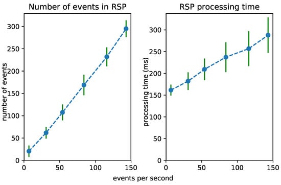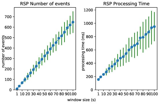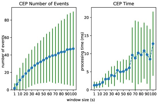 The influence of increasing the window size on the number of the to-be-processed events (left) and the performance (right) of the Event Processing Module.