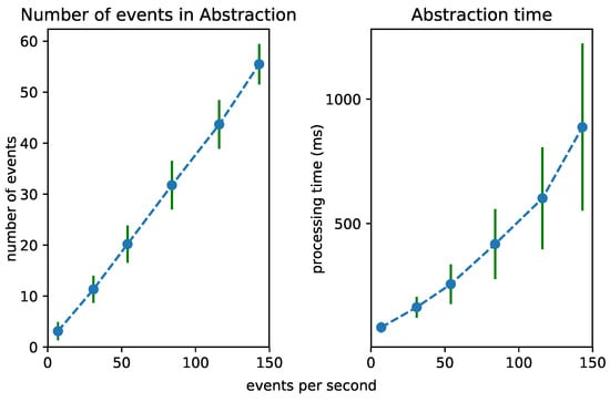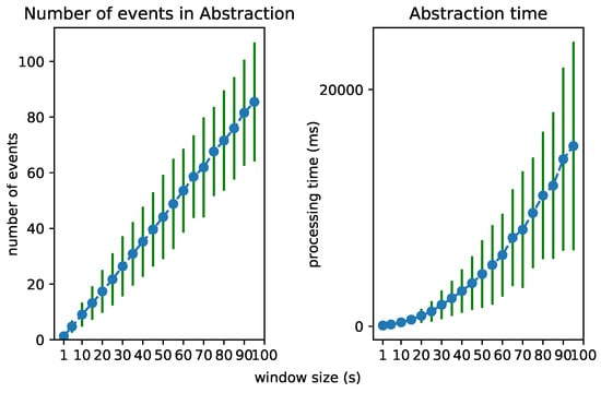 The influence of increasing the window size on the number of the to-be-processed events (left) and the performance (right) of the Abstraction Module.