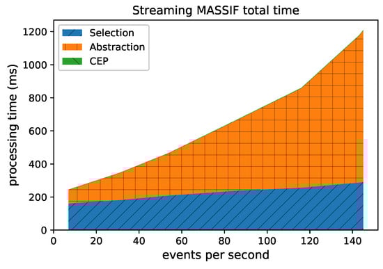 Since we extended the MASSIF platform to implement the adapted Cascading Reasoning vision, we also measure how fast the MASSIF platform could process the event stream. Note, however, that the MASSIF platform needs to perform the abstraction on all the background data, consisting of all the information of all the sensors, the streets, the offices, etc. All of the background data contain more than 60,000 statements. In the RSP layer, we select the relevant portion from the stream but also select the relevant data from the background knowledge. This eliminates the need for the Abstraction layer to contain the whole background knowledge. The TBox is most important there. Without this selection step, the abstraction of a single event in the MASSIF platform takes up to 20 s. Figure 16 shows the comparison for different event rates. The figure shows that the layered approach is much more scalable. The first reason for the speedup is because, compared to MASSIF, Streaming MASSIF can process events in windows, while MASSIF processes each event one by one. The second reason is that events are filtered in Streaming MASSIF before they are exposed to the expressive reasoning, while each event in MASSIF goes through the expressive reasoning step. The last reason is that the whole background needs to be used for the reasoning step in MASSIF, while in Streaming MASSIF the background is spread between the Selection and Abstraction Module.