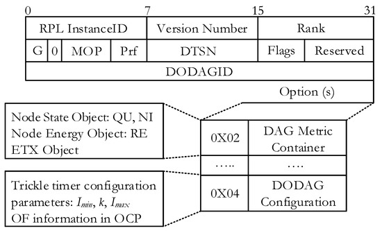 RPL constructs the topology based on the OF. The OF defines how a node chooses an optimized path within an RPL instance based on routing metrics and constraints. It also defines the specific criteria of optimization, for instance, minimizing latency, hop count, etc. In route construction, the OF can combine different node and link characteristic routing metrics. Along with, it helps to determine the candidate parent set and preferred parent, so that the data traffic is transmitted through the preferred parent. Currently, there are two standard OFs used that are objective function zero (OF0) [27] and the minimum rank with hysteresis objective function (MRHOF) [28]. OF0 uses hop count as the routing metric, whereas MRHOF uses expected transmission count (ETX) as the routing metric for path calculation. The metric that OF uses is determined by the metrics in the DIO metric container. The RPL instance uses the OF to compute the rank for the node. The rank value is an abstract distance to the DODAG root within the DODAG version. In order to avoid the loop, the rank must monotonically increase from the root towards the child. The way of the rank is calculated depending on the OF.