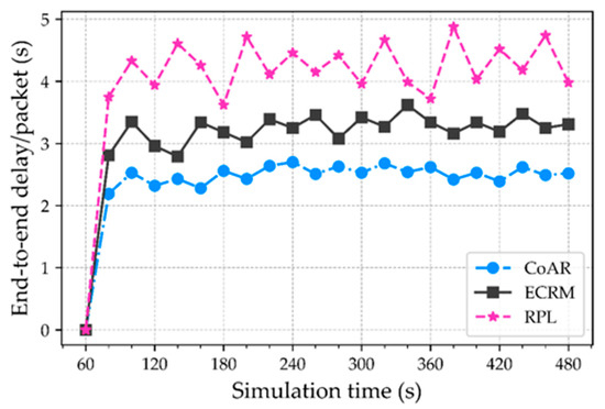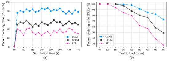Packet receiving rate (PRR). It is defined as the ratio between the number of packets received by the root and the number of packets sent by the source nodes. Due to the high data traffic from several sensing nodes, the packets may converge on a particular intermediate node and that results in the packet drop because of the buffer limit being exceeded. This situation leads to a fewer number of packets being received at the destination and, hence the PRR decreases. However, PRR is measured in the different time intervals based on the average over periods of 20 s. Figure 5a shows the PRR of CoAR, ECRM, and RPL with respect to the varying time. The result depicts the trend of the metric in the protocols is fluctuating over the time. Yet, CoAR obtains the smaller PRR fluctuation than ECRM and RPL when congestion occurs. In contrast, RPL lost most of the packets compared to CoAR and ECRM. This was expected because RPL does not aware of congestion in the network. The reason behind the higher PRR in CoAR is that it detects the congestion proactively and can bypass the affected nodes by selecting less or non-congested parent node.