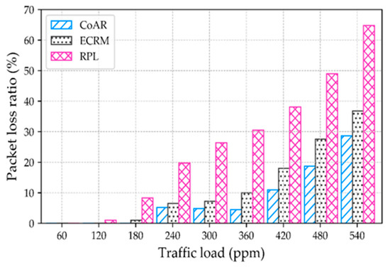 Packet loss ratio. Packet loss ratio is the ratio of the total number of data packets lost due to the buffer overflow to the total number of packets sent. Figure 7 compares the packet loss ratio with respect to the increasing traffic load of the protocols. The result shows the packet loss ratio increases with increases the traffic load. However, CoAR loses fewer packets at the buffer than others. When the data rate is high (i.e., 480 packets per minute), the packet loss ratio of the CoAR, ECRM, and RPL are about 20%, 27.6% and 50%, respectively. The reason behind the better performance of CoAR is, it because it reacts more precisely to congestion than other protocols.