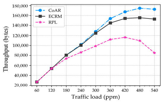 Throughput. It is defined as the total amount of data bytes received at the root node in unit time. Figure 8 shows the throughput of the protocols. The result shows that even though the throughput of all protocols increases with the traffic load, the variation is noticed under high traffic loads. CoAR, and ECRM achieve higher throughput with increasing traffic load compared to RPL. This reveals that both resource control algorithms can work effectively in the network with a higher load. On the other hand, RPL lowers the throughput after traffic load exceeds 360 packets per minute. The reason is that RPL does not utilize the network resource control strategy to alleviate the congestion. CoAR achieves the highest throughput at a high traffic load of 480 packets per minute. In contrast, ECRM achieves the lower throughput for the same data generation rate. The figure also depicts that when the traffic load is 480 packets per minute, the throughput of the network achieved by CoAR is 8.87% greater than ECRM.
