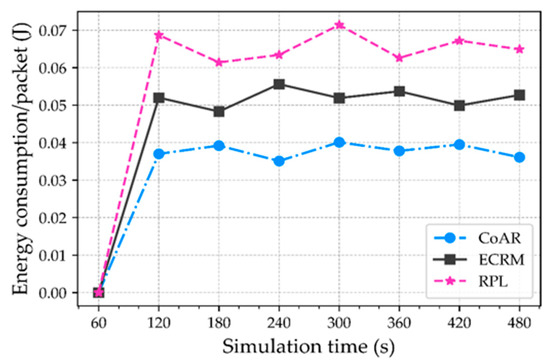 Energy consumption. The energy consumption due to the transmission and reception of per successfully delivered packet from source to the destination is considered. The energy consumption of nodes in the network is shown in Figure 9. We note that the energy consumption of CoAR in the network is significantly lower than the others. Because CoAR loses fewer packets at the buffer and minimizes the number of retransmissions. On the other hand, ECRM and RPL dissipate energy by transmitting and receiving packets which are lost due to the buffer overflow.