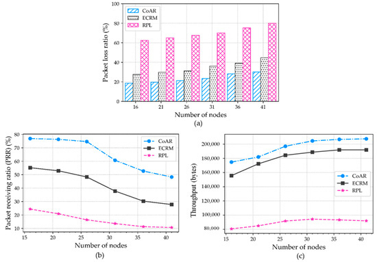 Data reliability over different number of nodes: (a) Packet loss ratio; (b) Packet receiving ratio; and (c) Throughput in bytes.