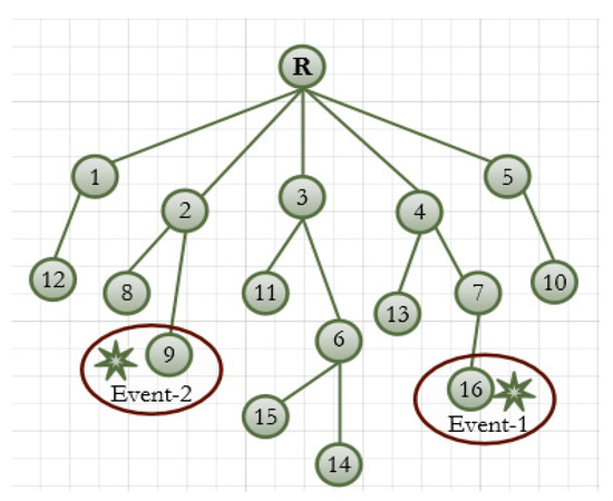 In this part, we illustrate the importance of responsiveness under a highly dynamic traffic model. Here, we consider the impact of dynamic traffic bursts at different time instants in an industrial monitoring network. Figure 11 shows a network topology and two source nodes suffering from an unusual event occurring in the monitoring region. The occurrence of the two events and their burst periods is given in Table 3. We assume that the event occurs near sensing node 9 and 16 during the time interval as described. Only sensing node 9 and 16 can detect the occurrence of events. Moreover, the event reporting frequency of the sensing node is greater than the continuous monitoring reporting frequency. Furthermore, every event injects data traffic with a rate of 16 packets every second, and there are two bursts for each event.