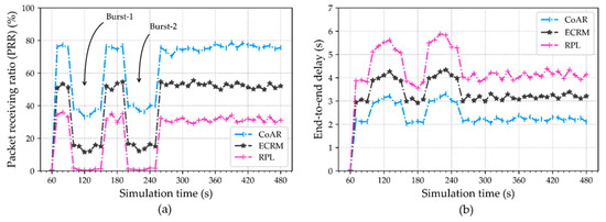 In Figure 12a, we observe that the adaptation capability of CoAR is higher than that of other approaches. Along with ensuring steady flow under low traffic loads, the CoAR is able to retain higher reliability (the packet receiving rate at root node) than ECRM and RPL even at bursty traffic durations. CoAR can effectively tolerate the burst because of its efficient congestion detection scheme and queue monitoring policy. As shown in the figure, we can note that the improved reliability of the CoAR is highlighted in terms of receiving packet rate at the time of two bursts (100~150 s, 200~250 s interval). This superior performance can be attributed to mainly, CoA-OF and adaptive congestion detection scheme. When the event occurs, the sensing node injects heavy traffic in the network and the queue occupancy of the parent increase sharply. As RPL does not have an efficient scheme to handle a large number of burst packets well, the packets are backlogged at the parent node in a very short interval. Therefore, RPL enters in an overloaded condition, which results in queue loss and delay hence the performance degrades. The ECRM is prone to congestion situation due to static congestion detection scheme and consecutive buffer overflow-based parent change policy, resulting in degraded network performance. Thus, dynamic traffic arrival, which is often a common phenomenon in industrial monitoring IoT application, can be better addressed and accommodated by our proposed scheme.