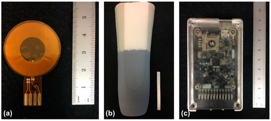 The wearable sensing system consisted of a low-profile sensor, a flexible iron-seeded elastomeric target, and a portable data acquisition unit (Figure 1) [16,17,18]. Sensors were embedded into prosthetic sockets and flexible targets were created by incorporating iron particles into elastomeric prosthetic liners so that the sensors measured the distance between the liner and socket wall.