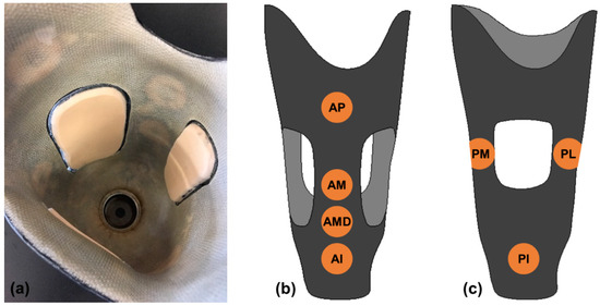 Sensors embedded into seven locations in the prosthetic socket: (a) socket with embedded sensors visible through Nyglass inner layup; (b) sensor locations of the anterior aspect of the socket; (c) sensor locations of posterior socket. Sensors anterior midlimb (AM), posterior midlimb medial (PM), and posterior midlimb lateral (PL) were fabricated on a latitudinal line at half the average height of each panel. Anterior proximal (AP); anterior midlimb distal (AMD); anterior inferior (AI); posterior inferior (PI).