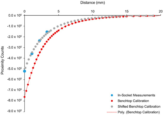 In-socket calibration data were offset along the x-axis from the benchtop calibration data. Offsets were calculated by converting the proximity counts measured during the in-socket calibration into distances using the unadjusted benchtop calibration data. Calculated distances were subtracted from the actual socket–liner distances (thickness of the offset pieces), and the median of these differences was taken to obtain a single distance offset for each sensor. Offsets were applied to the benchtop calibration to create individual calibrations for each embedded sensor location that reflected the sensor’s in-socket response.
