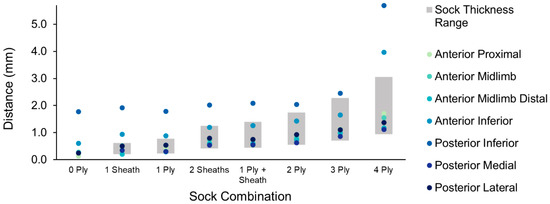 Sensor measured limb–socket distances and actual sock thickness range for each sock combination worn by Participant 1. The sock thickness range was measured between 0 and 121.5 kPa using a benchtop measurement system. Sensors did not measure equivalent distances for a single sock combination. Distances greater than the maximum sock thickness indicated an air gap between the limb and liner, whereas closer distances indicated greater compression of the sock over the sensor.