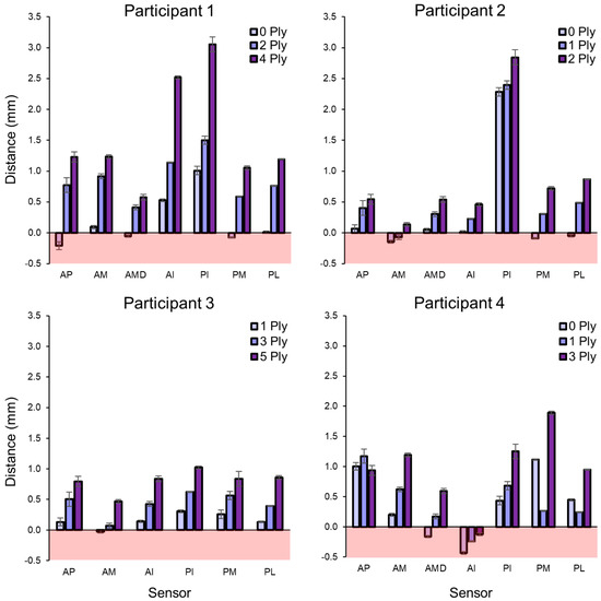 When participants wore thick socks compared with thin or no socks while walking, stance phase limb–socket distances increased, barring discrepancies at three sensors for Participant 4 (Figure 6). For that participant, the limb moved away from the socket wall in the anterior proximal region and closer in the posterior medial and lateral regions when a 1 ply sock was added. Such a change indicates that the addition of the sock significantly altered the fit of the socket, shifting loading from the anterior aspect of the socket to the posterior midlimb region. The substantial increase in stance phase distance for the inferior sensors for the 4 ply condition for Participant 1 suggests that the addition of the thicker sock caused the limb to sit higher in the socket and was likely “hung up” on the proximal aspects of the socket. Negative stance phase distances were likely the result of compression of the ferrous liner against the socket wall, as demonstrated in Appendix A.