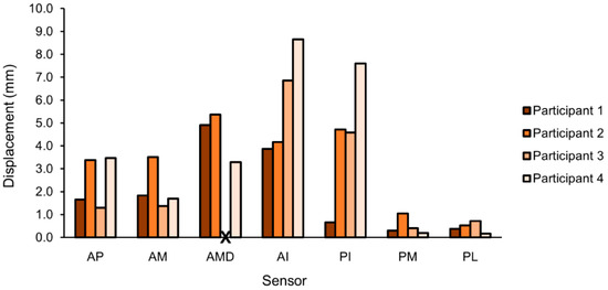 Peak-to-peak limb–socket displacements when participants wore an intermediate sock thickness. Participants had unique displacement profiles, with varied displacement magnitudes by sensor. Participant 3 did not have an anterior midlimb distal sensor.