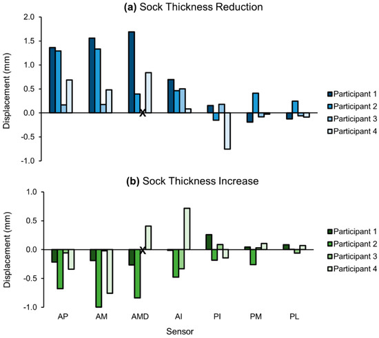 Peak-to-peak displacements typically decreased as sock thickness increased; however, the changes following a sock change were relatively small (Figure 8). When participants wore a thinner sock than the intermediate condition, the minimum and maximum changes in peak-to-peak displacements were −0.8 mm and 1.7 mm, respectively. The minimum and maximum changes when a thicker sock was worn were −1.0 mm and 0.7 mm, respectively. The mean displacement change magnitude was 0.42 mm for a sock thickness reduction, and −0.2 mm for a sock thickness increase. Not all sensors measured changes in displacement that followed the trend of lower displacements with thicker socks and greater displacements with thinner socks, indicating a non-global change in fit with the sock change.