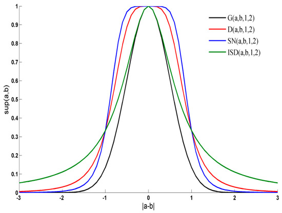 where K is the maximally allowable support and can control the amplitude of the function. β is acting as the attenuation factor of function. The larger the β the more meaningful differences in distance. It should be noted that a = b makes the sup(a, b) = K. Thus, the distance between a and b will get larger, sup(a, b)→0. Gaussian support function is symmetric and lies in the unit interval. The calculation of this sup(a, b) relies on the exponent operation.