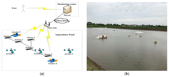 The topology of wireless sensor networks (WSN) monitoring system (a) and the field deployment of sensors (b).