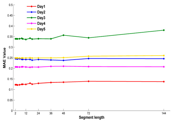 Figure 4 and Figure 5 show the MAE and time of different segment lengths in five days. As illustrated in Figure 4, the overall trend of MAE value is basically in a stable state with different segment lengths in five days. On the other hand, the run time is different obviously in Figure 5. The overall trend of run time varies with the segment length linearly. Considering these two metrics together, the segment length is 2, and the weighted fusion method with DTWS-ISD support function can obtain a stable MAE value in less time.