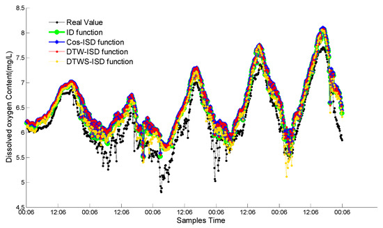 To evaluate the DTW distance and time series segmentation strategy in DTWS-ISD method separately, we proposed other three functions: ISD, Cos-ISD (improved ISD by Cosine similarity [40,41]) and DTW-ISD. The cosine value of the angle is also introduced to replace the Euclidean distance and improve the ISD function. Figure 6 shows the fusion results of these functions. Here, x coordinate represents the different times (720 time points) in five days, y coordinate represents the dissolved oxygen content.