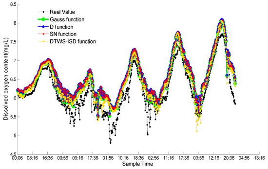 In this experiment, we compare the performance of DTWS-ISD with Gauss support degree function [22], D function [23], and SN function [24]. Figure 7 shows the weighted fusion results of four functions. Here, x coordinate represents the different times in five days, and y coordinate represents the dissolved oxygen content.