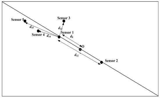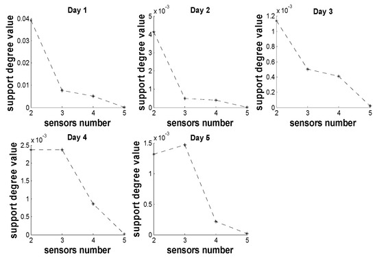 In the process of multi-sensors fusion, the locations of sensors influence the accuracy and reliability of data. Figure 8 shows the distribution map of five sensors in aquaculture pond. D = {d12, d13, d14, d15} (d13 < d14 < d15, d12 = 2d0) represents the distance between Sensor 1 and the other sensors, d0 denotes the distance between Sensor 1 and the center point O. Sensor 1 and Sensor 2 are distributed symmetrically to the point O. To analysis the correlation between sensor’s locations and mutual support degree, Figure 9 gives the support degree of four sensors to Sensor 1 over five days. Here, x coordinate denotes the sensors number, and y coordinate denotes the sensors’ support degree to Sensor 1.