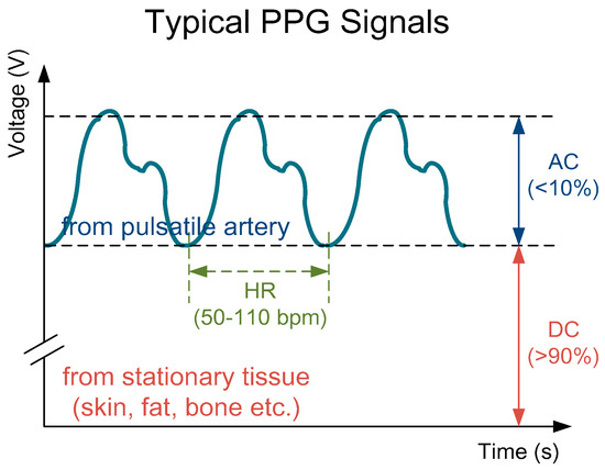 PPG sensors are optical sensors for measuring intravascular blood volume changes noninvasively. A typical PPG signal is composed of a small pulsating part denoted as AC, and a large stationary part denoted as DC, as shown in Figure 2.