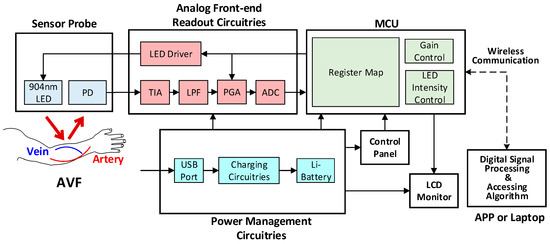 The analog readout circuitry of the proposed PPG sensors is composed of a light emitted diode (LED), a programmable LED driver, a photodiode (PD), a transimpedance amplifier (TIA), a low-pass filter (LPF), a programmable gain amplifier (PGA), and an analog-to-digital converter (ADC), as shown in Figure 3. First, at the probe, the LED with 904 nm wavelength is used, of which light may penetrate the typical depth of the AVF, as shown in Figure 5. Second, the TIA circuit is proposed to transform the current signals from the PD into voltage signals, which are much preferred in discrete circuit applications. Next on, to deal with the ambient light flickers from power lines (50 or 60 Hz), where the frequency is much higher than the heart rate frequency (0.8 to 2 Hz), the LPF with cutoff frequency 10 Hz is designed herein. Moreover, the PGA circuit and the programmable LED driver are designed herein to increase the signal-noise ratio (SNR), as well as to avoid the sensed signals from saturation by controlling the amplitudes of PPG signals to fully use the dynamic range of the ADC. Finally, the converted digital PPG signals from the ADC will be transmitted to the MCU and then transmitted to smart phone APPs or laptops via Bluetooth for further signal processing and assessing algorithms.