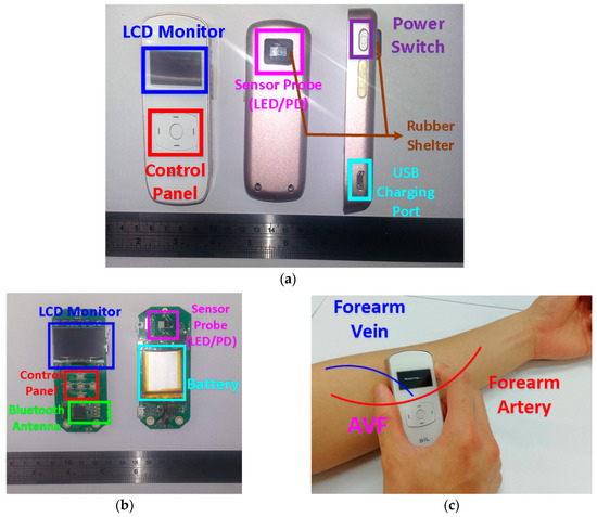 (a) The front, back, and side of the designed PPG sensor for assessing AVF. (b) The hardware circuitries of the designed PPG sensor. (c) The photo of the proposed PPG sensor measuring.