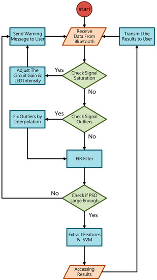 The flow chart of the digital signal processing in the proposed PPG sensor system.