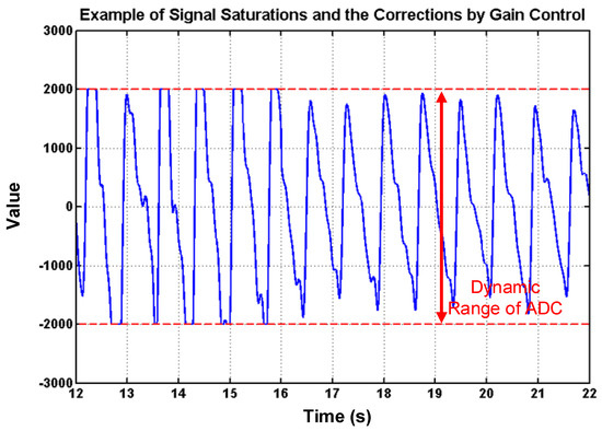 PPG signal saturations and the corrections by using gain control, where it can also be seen that the amplitudes are controlled to full dynamic range of analog-digital converter (ADC) to increase the signal-noise ratio (SNR).