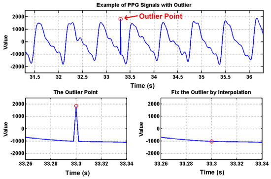 To deal with PPG signal anomalies, four digital signal processing algorithms are designed herein, including the saturation detection, the outlier fixing, the finite impulse response (FIR) filter, and the power spectrum density (PSD) evaluation, as shown in Figure 6. First, the signal saturations are detected to avoid failure in extracting the features from PPG signals. The programmable LED light intensity driver and the PGA in the readout circuitries are designed to deal with signal saturations by decreasing the signal amplitude to fit the full dynamic range of ADC, as shown in Figure 7. Second, the signal outlier fixing process is introduced to fix the pulse noise caused by electrostatics due to constant contact of sensor and skins. The signal outlier points can be detected by observing the slope of PPG signals, and then they can be fixed by using interpolation, as shown in Figure 8. Next, to deal with the low frequency motion artifacts, such as vasomotion (0.8–0.25 Hz), respiration (0.2–0.4 Hz), etc., an FIR bandpass filter with cutoff frequencies 0.82 Hz and 10 Hz is designed to cancel the DC drifting, as shown in Figure 9. Finally, for other non-periodic motion artifacts, such as patients’ talking, moving, etc., the PSD evaluation method is introduced herein to provide a quantitative index for describing the quality of PPG signals [6]. It can be seen from Figure 10 that PPG signals are contaminated by motion artifacts with much lower PSD values due to the large white noise induced by the non-periodic motion. Therefore, by evaluating the value of PSD, proper warning messages can be sent to users to reduce the motion artifact noise. In summary, the four signal processing algorithms mentioned above are able to check and fix the signal anomalies in real time and to increase the SNR, as well as to reduce the motion artifacts.
