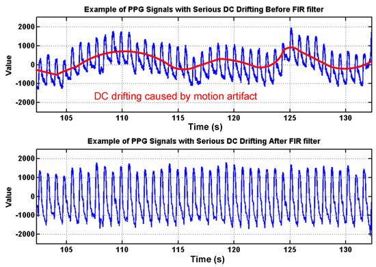 Effects of the proposed finite impulse response (FIR) filter to cancel the DC drifting caused by low-frequency motion artifacts, such as vasomotion, respiration.