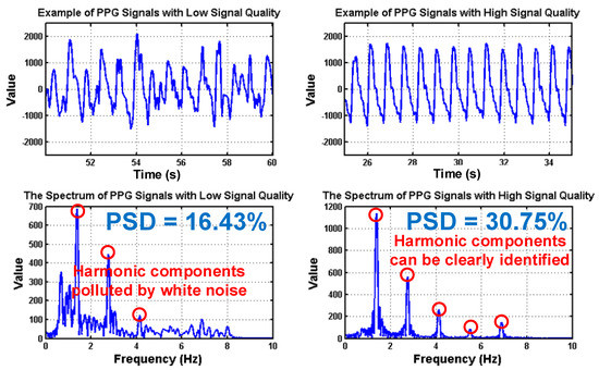 PPG signals with low and high signal quality following the corresponding spectrums, where the values of power spectrum density (PSD) are also shown.