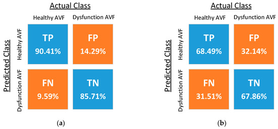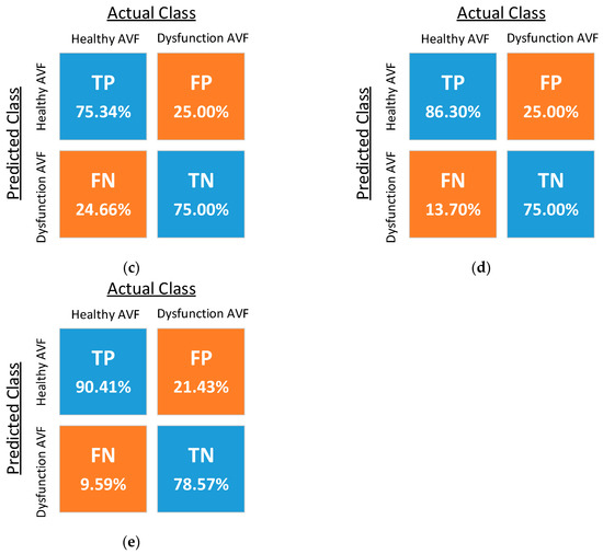 In addition, Table 2 also shows that the accuracy of the classifier using the fourth-order polynomial kernel is very close to the RBF kernel’s. Therefore, it can be deduced that the order of the five features derived from Equation (4) is possible to be fourth. This deduction is consistent with the known Hagen–Poiseuille Equation, where the flow of incompressible, laminar, steady fluid inside a cylindrical, solid tube is proportional to the fourth order of vessel radius, which is also proportional to PI based on Equation (3). More future works can be conducted on related topics about extracting other features for improving classifiers, and about determining the exact function for assessing AVF by combining numerical analysis and fluid mechanics simulation.