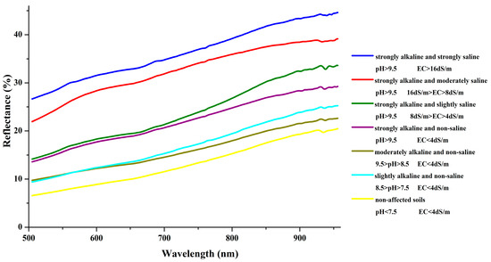 The spectra of soil samples in each pH-EC level are averaged into one spectrum and demonstrated in Figure 2. Generally, the spectral curves from 505 nm to 956 nm have similar shapes, and the reflectance decreases with low soil alkalinity and salinity levels. The trends are further significant in the 505–567 nm regions. For TOC, the reflectance decreases with soil TOC content increase except in the strongly alkaline and moderately saline level. For CO32−, the reflectance further significantly decreases with the decrease in soil CO32− content. Notably, the trends are statistically significant in all levels, including the non-affected soil. So, the short wavelength bands can be used to quantitatively estimate the pH and EC in a wide range of soil salinity and alkalinity.