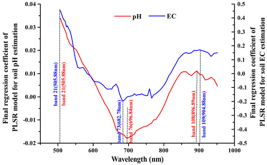 In the two PLSR models (pH and EC), the final regression coefficients of HSI image bands from 21 to 115 (505–956 nm) are calculated and plotted in Figure 3. The final regression coefficients can denote various contributions of these bands to the PLSR model estimation. To estimate soil pH and EC, the final regression coefficients ranged from −0.018 to 0.034 and −0.196 to 0.454, respectively. The final regression coefficient curves showed significant troughs and peaks in wavelengths which were sensitive to soil pH and EC. For the soil pH, the regression coefficient curve had two peaks and one trough that indicated the highest importance in the regression model: band 21 (band center: 505.88 nm), band 108 (band center: 896.89 nm), and band 76 (band center: 696.84 nm). To estimate the soil EC, the final regression coefficient curve had similar two peaks and one trough: band 21 (band center: 505.88 nm), band 73 (band center: 682.78 nm), and band 109 (band center: 904.88 nm). All these bands were in green, red, and NIR regions, and those at short wavelengths had high contribution to the models. As a consequence, the three sensitive bands were used instead of 95 bands to construct new PLSR models. For pH, the three-band PLSR model also exhibits good performance with R2 = 0.74, RMSE = 1.01, and RPIQ = 4.02. For EC, the R2 of the PLSR model is low (R2 = 0.36), the RMSE value is 19.63 dS/m, and RPIQ is 0.13 (Table 4), indicating the non-reliable model. When model validation was performed, the RMSE values for pH and EC reached 1.26 and 18.96 dS/m, respectively. The performance statistics of the three-band PLSR models were very close to those models constructed by using 95 bands. Therefore we adopt the three-band PLSR method in this study. These reflected the reasonable accuracy of PLSR method.