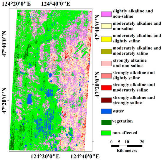 Figure 4 maps eight alkaline and saline classes of soils in accordance with the above-mentioned pH-EC levels in different color codes. Water and vegetation were separated from bare soils with NDVI < 0.05 and NDVI > 0.3, respectively. All these non-soil land covers are also color coded in Figure 4. Statistically, the alkaline and saline soils covered 46.24% of the mapping area. Slightly and moderately alkaline soils were 24.28% and 16.48% of the mapping area, which were the dominant alkaline and saline classes (88.15% of all the alkaline and saline classes), respectively. The four classes (strongly alkaline, strongly alkaline and slightly saline, strongly alkaline and moderately saline, and strongly alkaline and strongly saline) accounted for 5% of the mapping area. Notably, the two classes (moderately alkaline and slightly saline and moderately alkaline and moderately saline) were not identified in the abovementioned pH-EC levels. The two classes were negligible at 0.31% of the mapping area. In addition, the water, vegetation, and non-affected soil were 4.83%, 2.93% and 46.00%, respectively. In Figure 4, the alkaline and saline soils are near the rivers’ entrance to the mouth of the Zhalong Wetland. Compared with the distribution of alkaline soils, the saline soils were rare and overlapping on the strongly alkaline soils.