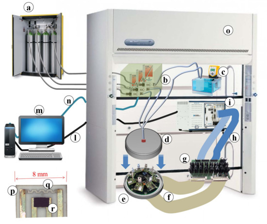 (a) Gas reservoir; (b) mass flowmeters; (c) bubbler; (d) stainless steel measurement chamber; (e) array of eight sensors; (f,h) signal connection cables; (g) heater drivers; (i) NI-PXI (PXI System-National Instruments) for real-time application; (l) ethernet link; (m) host computer with NI Labview Software for automated tests; (n) serial link; (o) extractor hood; (p) alumina substrate; (q) temperature sensor; (r) screen-printed sensing material.