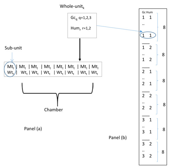 Panel (a) The split-plot structure for each gas with a general Whole-Unit (WU) and the related Sub-Unit (SU). (l = 1, ..., 8; t = 1, ..., 4). Panel (b) shows the WP structure with the 6 WUs, with each WU split into 8 SUs. Gc: gas concentration; Hum: humidity; Wt: working temperature; Mt: material type.