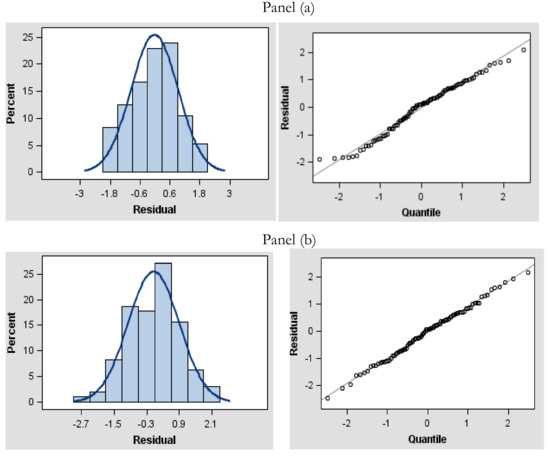 Iteration number 1 (panel (a)) and iteration number 2 (panel (b))—Pearson residual histogram with Normal probability density function (p.d.f.) and Q-Q plot for the main weighted split-plot model.