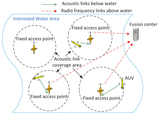 The system under consideration consists of multiple AUVs, several fixed access points and a remote fusion center. Denote the AUV index set as . The AUVs are equipped with sensors and acoustic communication units. They take field measurements at discrete sampling locations as they navigate along their trajectories. A total number of access points are placed at fixed locations, serving as gateways for communications between AUVs and the fusion center. The acoustic links are used for underwater information exchange between AUVs and access points, and the radio frequency links are used for in-air information exchange between access points and the fusion center. With the access points, the data collected by AUVs can be sent to the fusion center for centralized processing. An illustration of the system layout with three AUVs and four access points is shown in Figure 1.