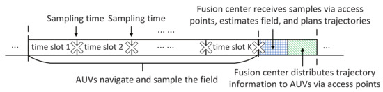 The system operates on an epoch-by-epoch basis. An illustration of the system operation within each epoch is shown in Figure 2. The trajectories for all the AUVs in the ℓ-th epoch are determined at the end of the -th epoch based on the collected field samples. For each AUV, the planned trajectory consists of K waypoints. It takes one time slot for the AUV to travel from one waypoint to the next. Each AUV collects field measurements around the waypoints. After the AUV reaches the last waypoint in the current epoch, it transmits the observed data and the corresponding sampling locations to the nearest access point via underwater acoustic links. The access points then relay all the information to the fusion center via radio frequency links. The fusion center estimates the field values at target points in based on all the observations and updates the estimation of the field spatial correlation parameters. It then determines the trajectories for all the AUVs in the next epoch and transmits via access points the planned trajectories to all the AUVs. At the end of the ℓ-th epoch, all the AUVs receive their planned trajectories in the next epoch.