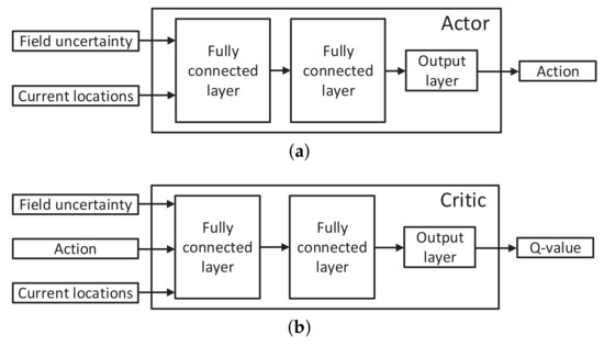 A critical issue of the DDPG method is how to design the actor and critic neural networks. In this work, the action for each AUV is parameterized by the moving distance within each time slot along each dimension of the area for K time slots in total. The structural design of the actor and the critic is presented as follows. For the actor, as illustrated in Figure 3a, the current field uncertainty and current locations of all the AUVs go through two fully-connected layers with rectified linear units as the activation functions. The output layer takes the summation of the outputs of the second fully-connected layer and uses the tanh activation function to bound the elements of the action to be within (the use of the tanh function will be clear shortly). For the critic, as shown in Figure 3b, the field uncertainty and the current locations and actions of all the AUVs go through two fully-connected layers with rectified linear units as the activation functions. The output layer of the critic is the summation of the outputs of the second fully-connected layer. Consider the online application in this work. The structural design of the actor and critic networks should achieve learning efficiency to balance the system performance and the computational complexity.