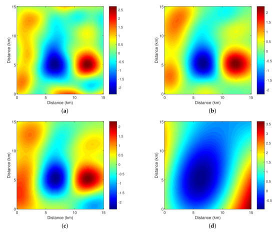 The true field and the estimated fields obtained by the three schemes. (a) True field; (b) Estimated field by Scheme 1; (c) Estimated field by Scheme 2; (d) Estimated field by Scheme 3.