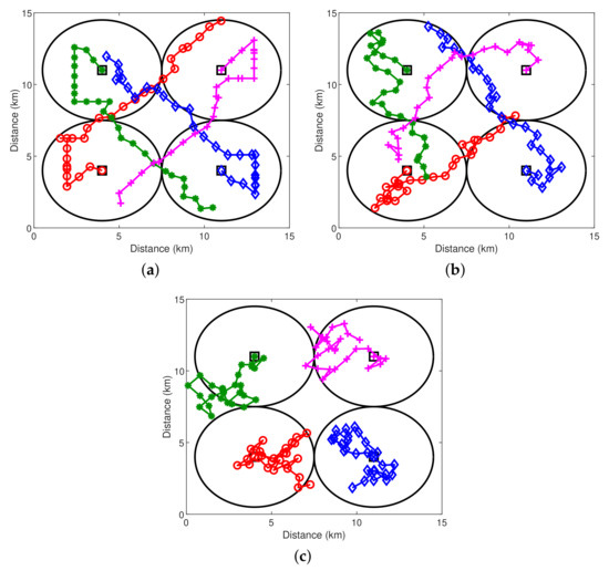 Trajectories of four AUVs obtained by three schemes. The squares indicate the positions of four access points and the initial deployment locations of four AUVs. The circles indicate the acoustic communication coverage of four access points. (a) Scheme 1; (b) Scheme 2; (c) Scheme 3.